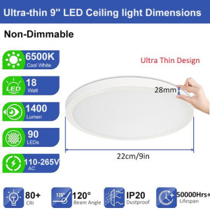 Cool White & Ultra-Thin Design: LED flush mount ceiling light with 6500K cool white color, Non-Dimmable, which is compatible with most household and commercial areas. 22cm diameter LED ceiling light is only 2.8cm in thickness. It is ideal for hallways, bathrooms, kitchens, closets, stairwells, bedrooms, living rooms, corridors, entrances, porches, mud rooms, children's rooms, dining rooms, bars, cafes, offices, hotels, and restaurants.