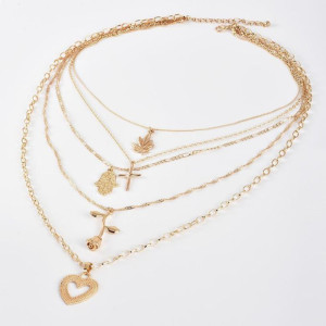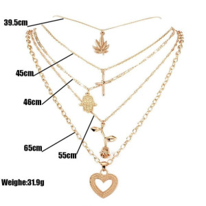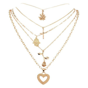 This necklace set is a perfect blend of fashion and individuality. Composed of multiple necklaces, it exudes unique charm. Made of alloy and carefully processed, it presents a bright and long - lasting golden luster. Each necklace has its own characteristics, with a rich variety of pendant elements, such as leaves symbolizing peace, the Hamsa hand representing protection, roses with auspicious implications, and a unique heart - shaped hollow pendant, which is delicate and eye - catching. The chains of different lengths can be freely combined and layered. Whether paired with a simple T - shirt to show casualness or with a dress for a party to highlight elegance and fashion, it can be easily matched, adding layers and highlights to the outfit. It's a must - have accessory for trend - seekers.